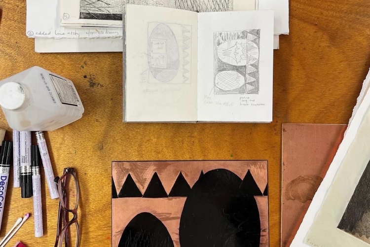 Intaglio in Depth is a deep dive into the wonderful world of etching! Students will learn to prepare copper plates for etching with ferric chloride. Safety procedures, studio chemistry, and solvent compatibility will be covered in depth. We will explore methods of etched mark-making beyond the drawn line including soft ground etching of found matter, spray paint aquatint with positive and negative resists, and more.