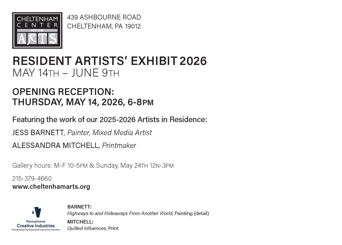 Our Artists in Residence for 2025-2026 will celebrate the end of their resident year and have this special opportunity to exhibit their work at the Center from Thursday, May 14th through Tuesday, June 9th. Opening reception Thursday, May 14th from 6-8pm. Featuring the work of Jess Barnett and Alessandra Mitchell.